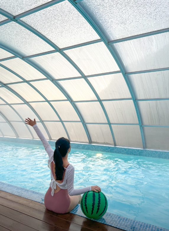 글램파크 글램핑 카라반은 아무래도 장점은 사진에서 보실 수 있듯이 사계절 내내 온수 수영이 가능하다는 점입니다.