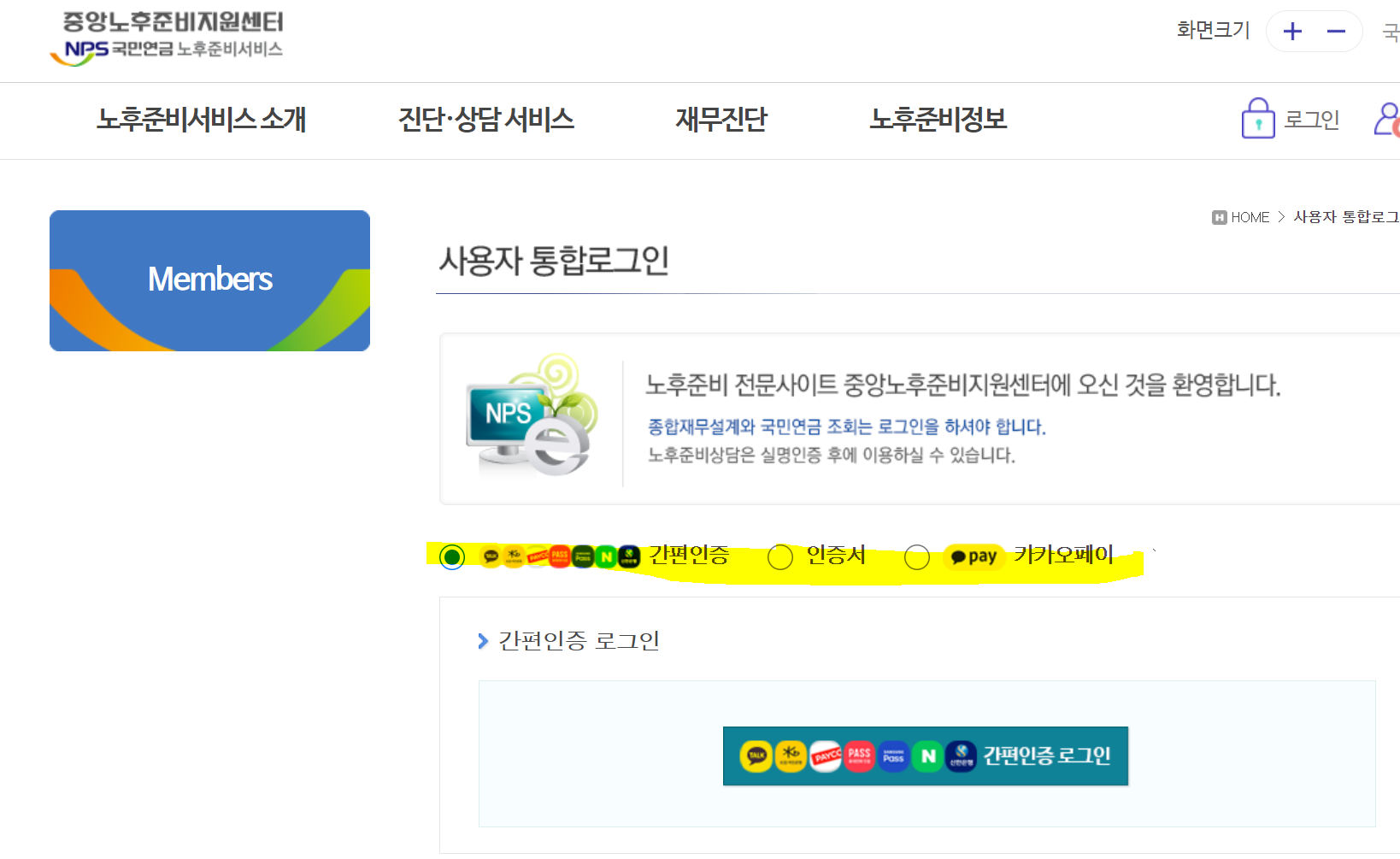 그런다음 간편인증과 인증서, 카카오페이 총 3가지로 인증을 해야합니다. 편하신대로 선택하여 인증을 해주시면 됩니다.