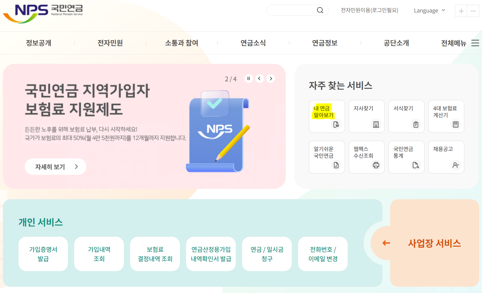 1) 국민연금공단 홈페이지에서 '자주 찾는 서비스' -> '내 연금 알아보기'를 눌러줍니다.