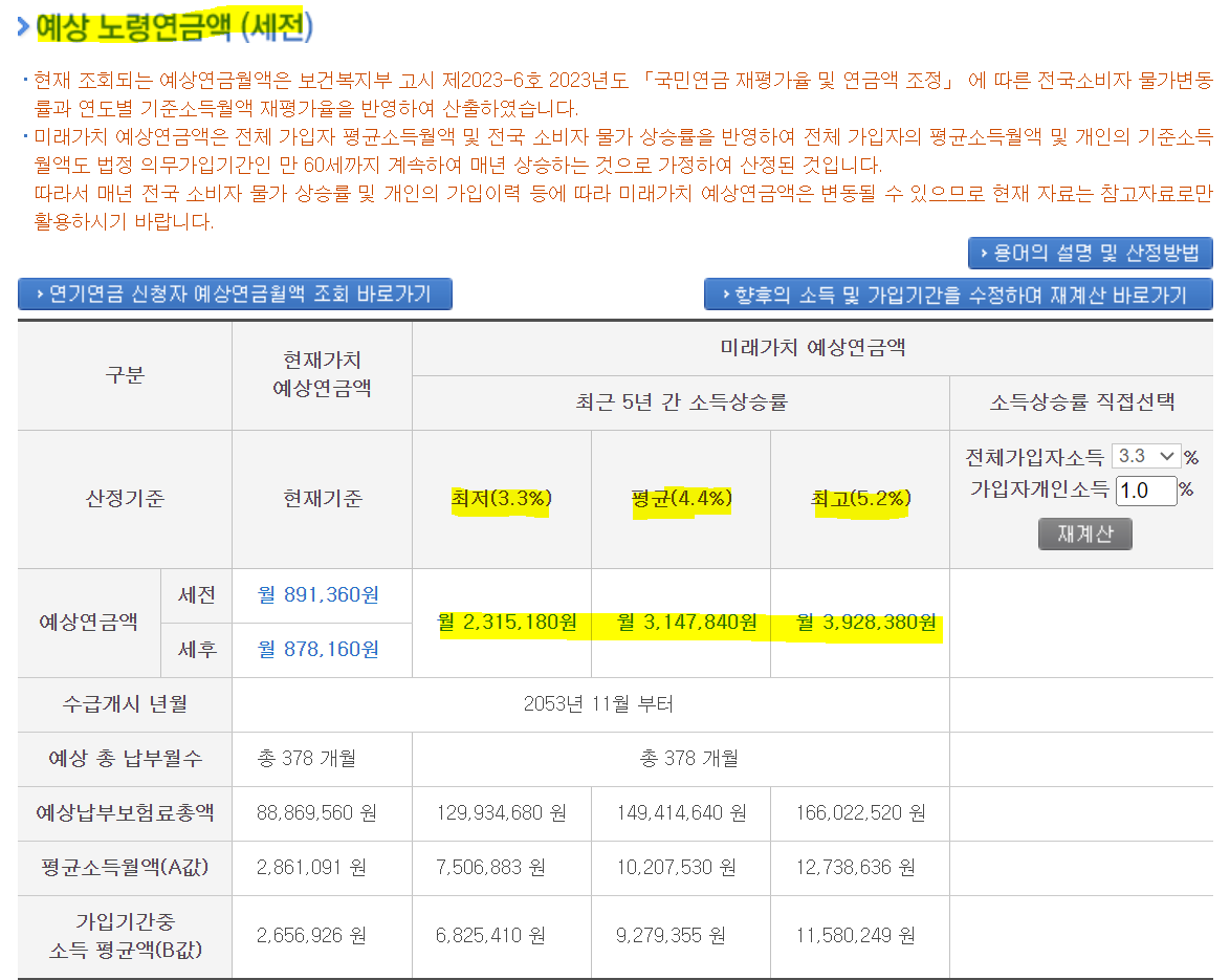 5) 인증을 마치면 현재 예상금액과 5년간 소득상승률을 반영하여 3.3% 최저부터 5.2% 최고까지 월 수령액을 확인 할 수 있습니다.