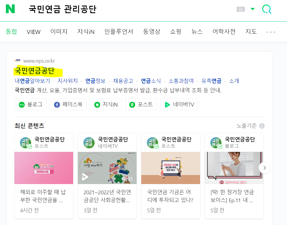 1) 포털 사이트에서 '국민연금 관리공단'을 검색하여 홈페이지에 접속을 합니다.