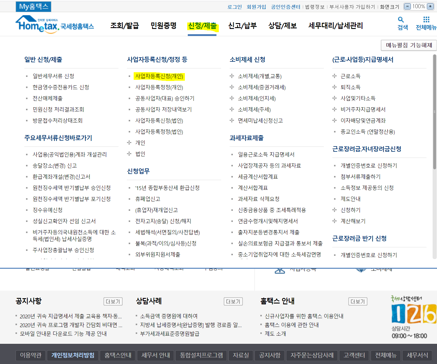 Step2. 홈택스 사이트 상단에 신청/제출 -> 사업자등록증신청(개인)