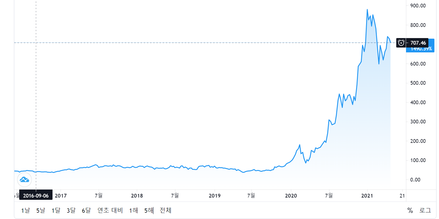 코로나로 인해서 60$대까지 하락을 했다가 20201년 1월에 870$까지 치고 올라가다,
