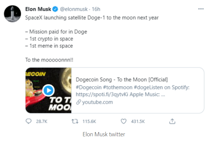일론 머스크는 트위터에 도지코인 송을 첨부하고 'Doge-1 Mission to the moon'을 출시하겠다고 밝히기도 했습니다.