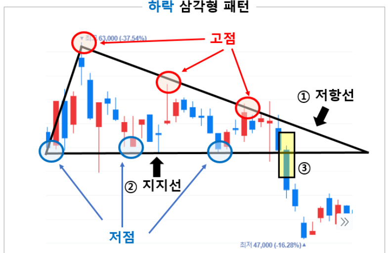 이번에는 지지선이 유지되면서 저항선이 우하향하고 있는 형태가 보이실 것입니다.