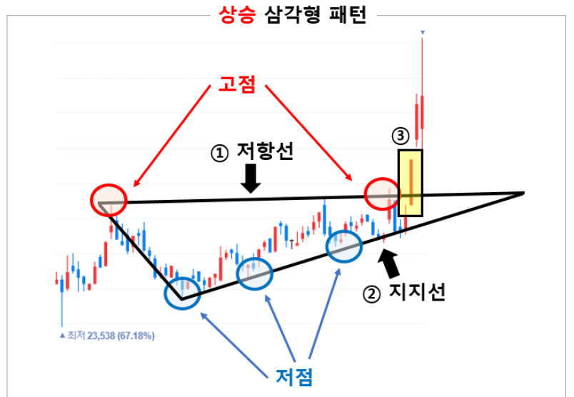 이러한 차트 모양을 상승 삼각형 패턴이라고 합니다.