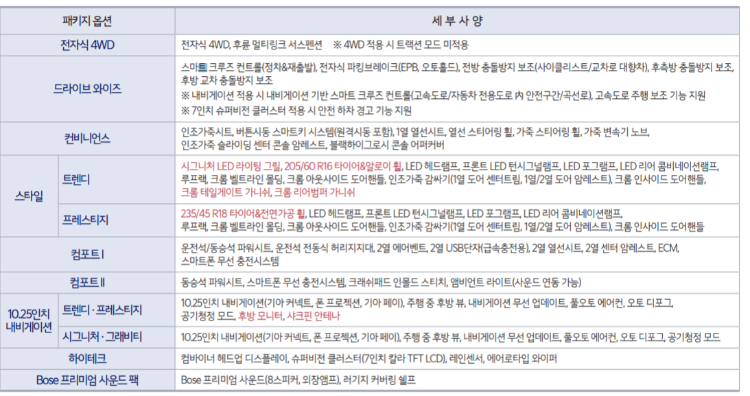 다만, 아시다시피 트림별로 넣을 수 있는 옵션이 있고, 상위 트림으로 가야만 넣을 수 있는 옵션으로 나뉘어져 있습니다.